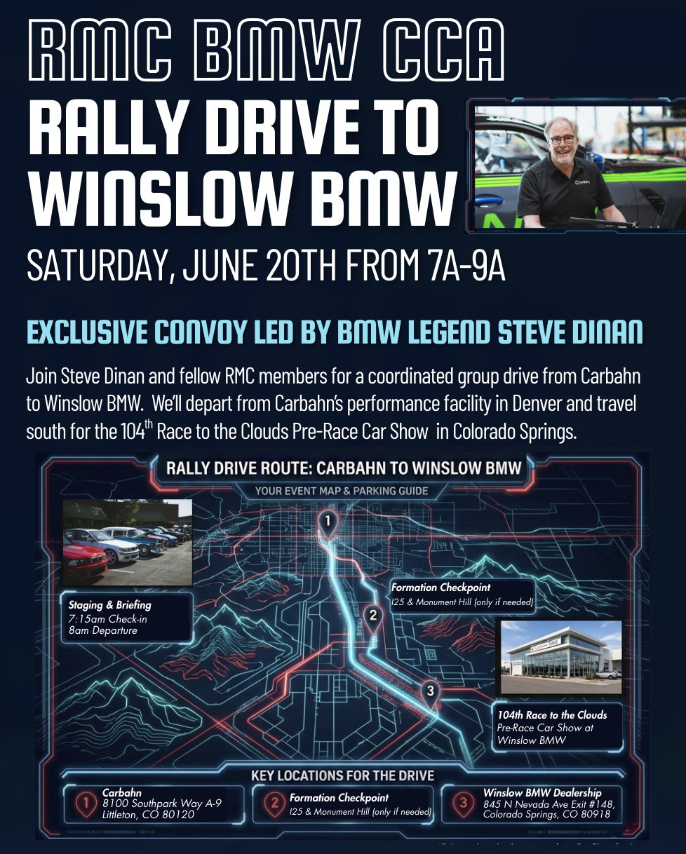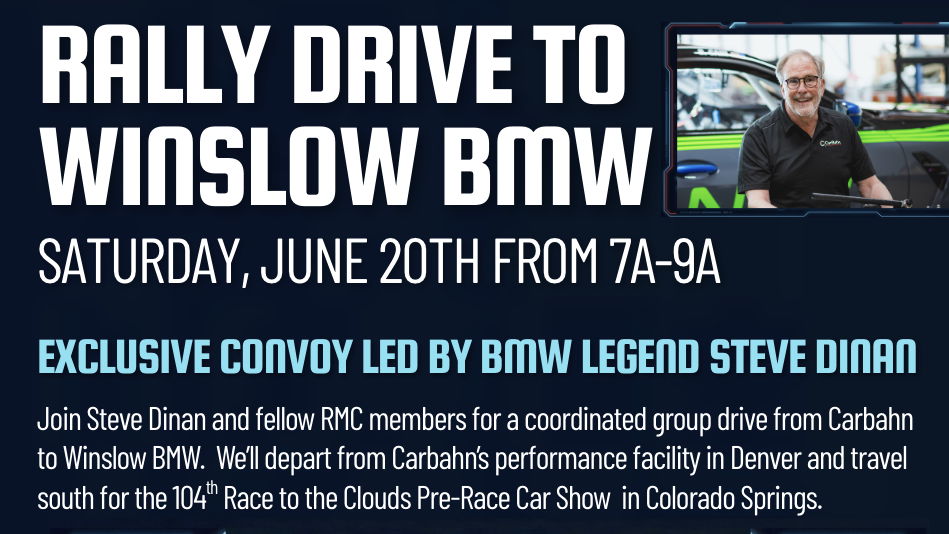 Don't miss this opportunity to participate in a Chapter-led drive alongside one of the industry’s most respected engine builders and tuners. Join Steve Dinan and fellow RMC members for a coordinated group drive from Carbahn Motorsports to Winslow BMW. This convoy offers a structured route from Denver to Colorado Springs, departing from Carbahn’s performance facility and concluding at the dealership in time for Winslow BMW's PreRace to the Clouds Car Show event.